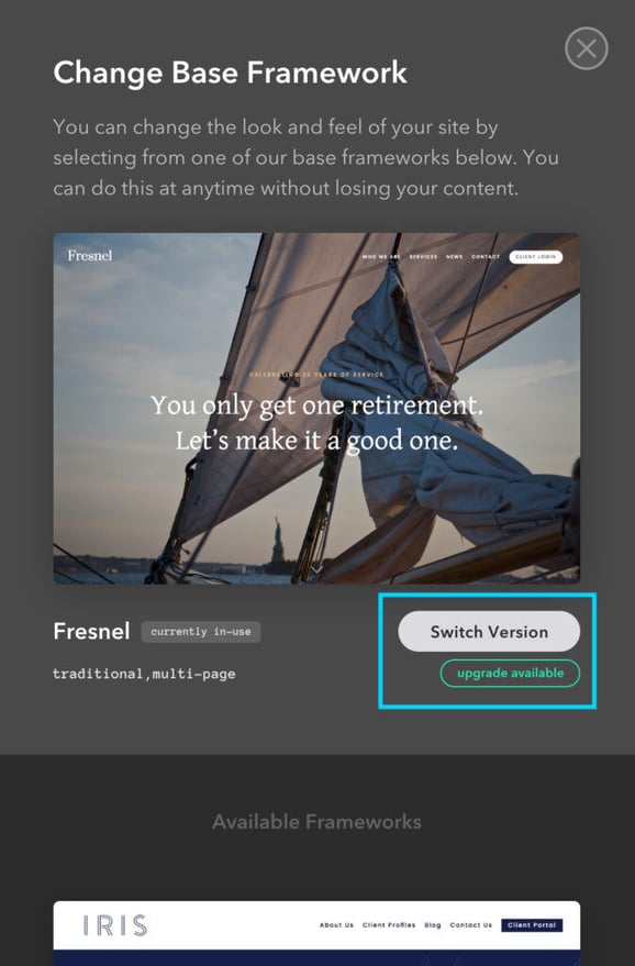 Please note: You can change or upgrade your website’s framework at any time. While all of your existing website content and website settings will be retained, you may experience formatting issues, especially if you have custom styles in place.