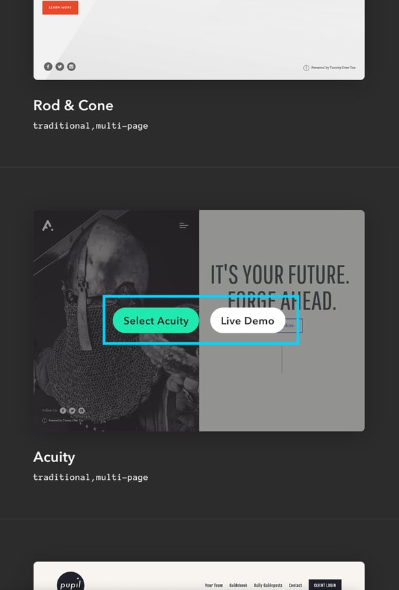 If you’d like to switch to a different framework entirely, you can browse the list of available frameworks below your currently active framework. Simply hover over the framework thumbnails to see options for a live demo and switch to that framework.
